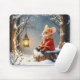En söt mus klädd i en röd jacka- och halsduk på en snö-täckt träd-stump, tittar på en glödande lanter, omgiven av en vinterskog