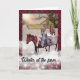Vintern på odlingsanläggningen med blanka vikningskort röd lampa och snö med fyra hästar i snö med sol-stråle