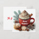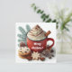 Vinterpipande gräddkaffe i röd mugg i hett julkort
