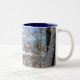 Denna mugg visar en vinterplats med en byggnad som är synlig till och med snö-täckte trädgrenar.