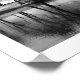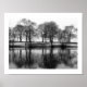 Ett svart och vitt foto av träd på en snöbank som reflekteras i den stora dammen under skapande av en vinter mönster.