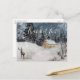 Vintersceneri Stuga Julkort Julpostkort. Snöig bakgrund med en stuga och rådjur.