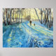 En oljemålning på arbetsytan. En man går sin hund i snö.