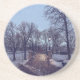 Panoramisk syn på snöparken vid snöstormen med ljus, kanal och dekorativ bron i tidigt på kvällen