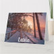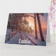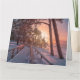 Vinterlandskap med täckning i snö gräs och träd under solnedgången. Vy över barrskog med träbana nära havs kusten.