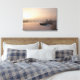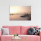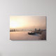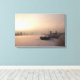 I Canvas landskap skrivs en soluppgång över en frusen kanal med snö och en båt med vissa vindkraftverk på vintern i Kinderdijk i Nederländerna.