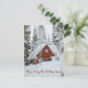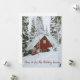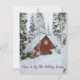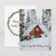 Vinterstuga i vildmarken semester vykort. Röd stuga och snöiga träd.
