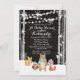 Rustiska vinterscener med svart bakgrund av trämaterial, elegant, modernt och vinter-underjordiskt duschtema för babydusch i party med snöflingor, snö, snöre, ljus, djur och björk i träd. Perfekt för firande och babyduschar på vintern. Anpassa all party-information till anpassadet.