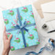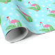 Julflamingomönster. Fåglar i tomathatt med snötropiska handflatan löv och vit snöflingor, på blå bakgrund. Konstruktion för kur vinter.