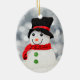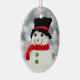 Keramisk prydnad som presenterar en bild av en gullig snögubbe i snön.