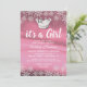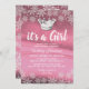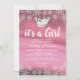 Vintertema flicka bebis shower inbjudningar med rosa bakgrund, glittrande vita snöflingor, silver krona och en personlig bebis shower mall.