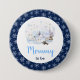Den här söta och fantasifulla akvarellknappen för baby shower har en akvarell vinter-världscen med förtjusande arktiska djur, som isbjörn, pingvin, katt, val, säl och älg. I bakgrunden syns snötäckta berg, isar och träd. Texten kombinerar handskriven skrivstil och sans serif-teckensnitt för en stilren och modern look. Fallande snöflingor och vackra blå blomsterarrangemang ger en vinterkänsla. Den här är perfekt för vinter- och julbaby shower.
