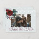 Rödburgundisk vin och vita akvarell peonrosor bouquet med jägargrona säsongsgranar och lövverk, rustika strängar med vita glimmljus och en chic burgundisk kalligrafi på en dammig blågrå bakgrund som skapar ett magiskt foto spara datum bröllopskort. +++++++++ Lätt att anpassa med din bild, namn och text! ++++++++++ Lämplig för blomsterinspirerade vinterrustika land-, bondgårds-, bergs-, sagoland- eller julinspirerade bröllop.