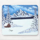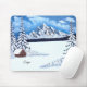 En musmatta med en vacker vinterscen med snöiga berg, rustik stuga och snötäckta barrträd. Bilden och texten kan anpassas. Originalkonst av W.B.