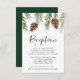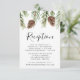 Rustiskt bröllopsmottagningskort med en gräns av vattenfärgade pinekoner och gräs boughs. "Mottagning" visas i ett modernt kalligrafiskript med information om ditt bröllop som visas nedan. Designad för samordning med vår Winter Watercolor Pinecone bröllop samling.