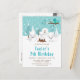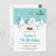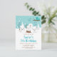 Denna söta och roliga födelseinbjudan visar en bedårande familj av arktiska rävar i en vintervett miljö med snötäckta träd och en blå fågel på en gren med järnekor. I bakgrunden syns en tealblågrön himmel och fallande snöflingor. Texten kombinerar dekorativa och sans-serif-teckensnitt för en stilren och modern look. Detta är perfekt för en jul- eller vintertematisk födelsedag.