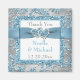Denna isblå, silvergrå och vita falska glitter blomdamast-mönstrade tack-magnet för bröllopsgåvor har ett blått tryckt band och rosett med ett par tryckta falska glitter- och diamantjuveler i form av sammankopplade hjärtan som matchar bröllopsinbjudningarna som visas nedan. Texten är anpassningsbar så att du kan ändra den till vad du vill. Om du önskar andra matchande föremål i denna design, vänligen maila din förfrågan till niteowlstudio@gmail.com.