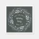 Napkin med namn med vintervitbär med krans mot sammetets grönt. Lämplig napkin för ett kontor party, vinterbröllop, jul party eller julfest.