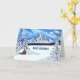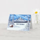 Ett julkort med en vacker vinterscen med snötäckta berg, städsegröna träd och en rustik stuga. Bilden och texten kan anpassas. Du har också möjlighet att ta bort texten. Originalkonst av W.B.