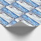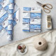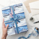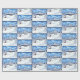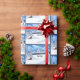 Presentpapper med en vacker vinterscen, inklusive snötäckta berg, stuga och städsegröna träd. Bakgrunden, bilderna och texten kan anpassas. Originalillustration av W.B.