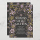 Modern vinter söt sexton inbjudan med guld- och rosa snöflingor på en trendig svart kritskriftsbakgrund.