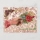 Fin vintage målning med en dam hand som håller och erbjuder en blomma med en vacker röd ros och ro, söt blåa blommor, glöm mig inte blommor, gräs och grönt löv med rödblommor på gräns blåa blommor och grund vid gräns rosa. med snöre .