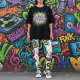 The Vinyl Groove leggings feature a repeating all-over print of vinyl records, neon jukeboxes, musical notes, and lightning bolt accents — all scaled carefully to maintain proportion when worn. This ensures the design flows naturally along the legs without stretching or distortion.