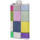 A metallic flask with a vibrant geometric grid design of twelve colorful squares. Featuring shades of pink, blue, green, yellow, purple, and gray, this modern flask combines practicality with artistic flair. Perfect for carrying drinks stylishly while adding a creative touch to everyday essentials.