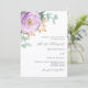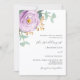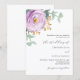 En vit bakgrund. Dekorerad med violett, lila blommigt, ro blommor och grönt vattenfärgad eukalyptus löv, sprig, grönsak och faux guld sprigs. Anpassa och lägg till din namn och information.