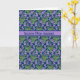 Ett hälsningskort för söt Mors dag, med hälsning i Fransk och mönster i violetta på mörk blått bakgrund, från en vattenfärgsmålning av Judy Adamson. Den här designen passar alla tre hälsningskortens storlekar.