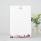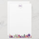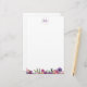 Ett ljust stänk av färg från en landträdgård är vad denna nätt brevpapper påminner oss av! Den nedersta gränsen fylls med färg, inklusive violetta rosor, blått, bleken - rosa, grönt och lavendel. Och upptill, är ditt monogram och namn bifogade med för gulddubbla för söt en rosa ram för sexhörning.