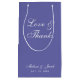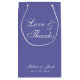 En enkel bröllagspresentpåse med en mycket modern nyans av violett. Den har bara vit text på lila bakgrund. Meddelandet "Kärlek & Tacksamhet" och brudens och brudgummens namn är skrivna med elegant kalligrafi.