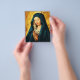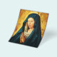 Bakgrunden till den rena och mörken står i kontrast till Virgins strålande boghuvud och den vita heaadressen som täcker den, och hennes händer är försiktigt försluten tillsammans