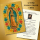Den har en vacker traditionell katolsk bild av Vår Dam i Guadalupe, Mexikanska jungfrun med akvatisk, röd och gul ros och guld shimmer-bakgrund. All text och typsnitt är på spanska och kan ändras.