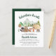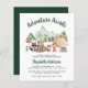 Budgetvänlig rustik virtuell baby shower-inbjudan med en söt akvarellillustration av skogslevande djur med tält och lägereld som campar i bergen och skogen och "Äventyr Väntar" och den blivande mammans namn i ett mörkt jägaregrönt manus.