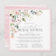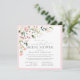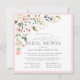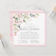 Modern kvadrat med elegant i virtuella inbjudningskort för möhippan med en blommigt av mjukt, vattenfärdigt ro i skuggor av rosa, persika och vitt, med lush grönt botaniskt löv i skuggor av kärlek och eukalyptus, och gränsad i rosa. Anpassa din möhippa i mjuk, svart och accentuerad med vacker, modern, handskriven kalligrafi. Kortets baksida har en vacker rosa vattenfärg struktur. Inbjudningskort för Elegant av upphovsrätt, alla höger reserverade.
