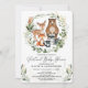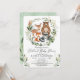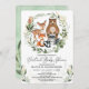 Elegant"virtuellare babydusch"-inbjudan med vidsträckt vattenfärgad illustration av skogsdjur och botaniskt grönt elegant i grönt och guld. Texten fält kan redigeras fullständigt. Du kan ändra ordalydelsen till kostym för din händelse, t.ex. födelsedagsdag, babydusch/sprinkning, baptism, döpning, namngivningsdag etc.