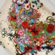 En livfull hjärtformad collage exploderar med intrikata blommönster och virvlande mönster. Konsten visar en blandning av färgglada blommor, abstrakta former och lekfulla klotter, som skapar en livlig och dynamisk komposition.