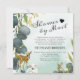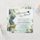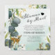 Skogskirurgi med e-postinbjudningar som innehåller en dammig grön/blå vattenfärgad tvätta, botaniska eukalyptus löv, stänk av faux guld foil, skogsmark baby djur och en modern babydusch från en ovanlig mall som är lätt att anpassa.
