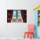 Visa genom ett fönster med gardiner som bortser från en fält av hö och balar