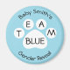 Den här magneten visningar en vit sida på en blå bakgrund och texten "TEAM BLUE" tillsammans med babyens efternamn och "genderna visar". De här magneterna är underbara för trycktema, tema för hund, katttema eller gender för djurtema som visar party.