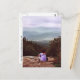 Det här vykortet har fotografi av en av de underbara hökarna i New Hampshire-bergen. En hiker har följt Nancy Pond-banan ända till utloppet i Norcross Pond, vilket ger spektakulära synpunkter på Pemigewasset Wilderness, Mt. Bond, Twin Range och Franconia Mountain Range. Han har lagt sin vandring på sten och vilar på en stor granitplatta. Han bär en röd bandana och en liten lila som säger: Support Jazz. Vista är storartad med himlar och berg i ett färg-område av blått, grönt och mauve.