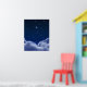 En poster vit twinkling-stjärna högt upp i mörken natt himlar över en kudde med fluffy white moln under.