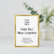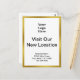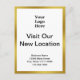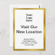 Front: A display image is at the top. You can replace the image with your logo. "Visit Our New Location" is in the center. Four lines of black display text for your business name and new address are at the bottom. The front has a faux (not foil) gold border.