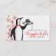 Den gulliga pingvinservitörportionen ett garnnystan med stickor på denna knitters visitkort med klotter blommar bakgrund.