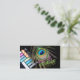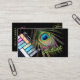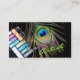 Designen för visitkorten för Makeupkonstnären med den härliga påfågelfjädern, det färgrika ögat skuggar palett- och rosaläppstiftkyssen på svart bakgrund. Denna snyggt profilerar kortet är perfekt för moderiktiga flickor, beauticians, cosmetologists, hår- och makeupskönhetsalonger och andra liknande yrken.