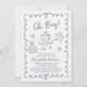 Trendigets återinspirerade pojke-duschinbjudan med ljussken, med en fransk blå vågigt ram, försedd med krage, vismblått hand plockade-illustrationer av hjärtan, stjärnor, kakor och dagis. "Oh Boy!" och namn i mor till att bli utvisad i ett roligt, lekfullt blått skript.