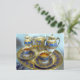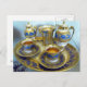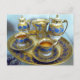 En guld och blå bricka för kaffe med matchande guld och blått kopp och såser, kaffe och mjölk-juggar och tillbehör