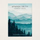 Kort för visning med en vattenfärg teckning från avlägsna berg och en skog i förgrunden och fält för företagsinformation och logotyp.