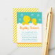 Detta söta duschkort för visning och roligt har ett snyggt gult anka och dunkar i vita soapy-badbubblor på en ljus grönt med orangens band och gult rand. Texten kombinerar handskript och sans serif typsnitt för en snyggt och ett modernt utseende. Det här är perfekt för en babyåda.